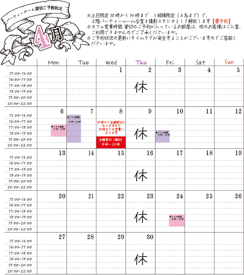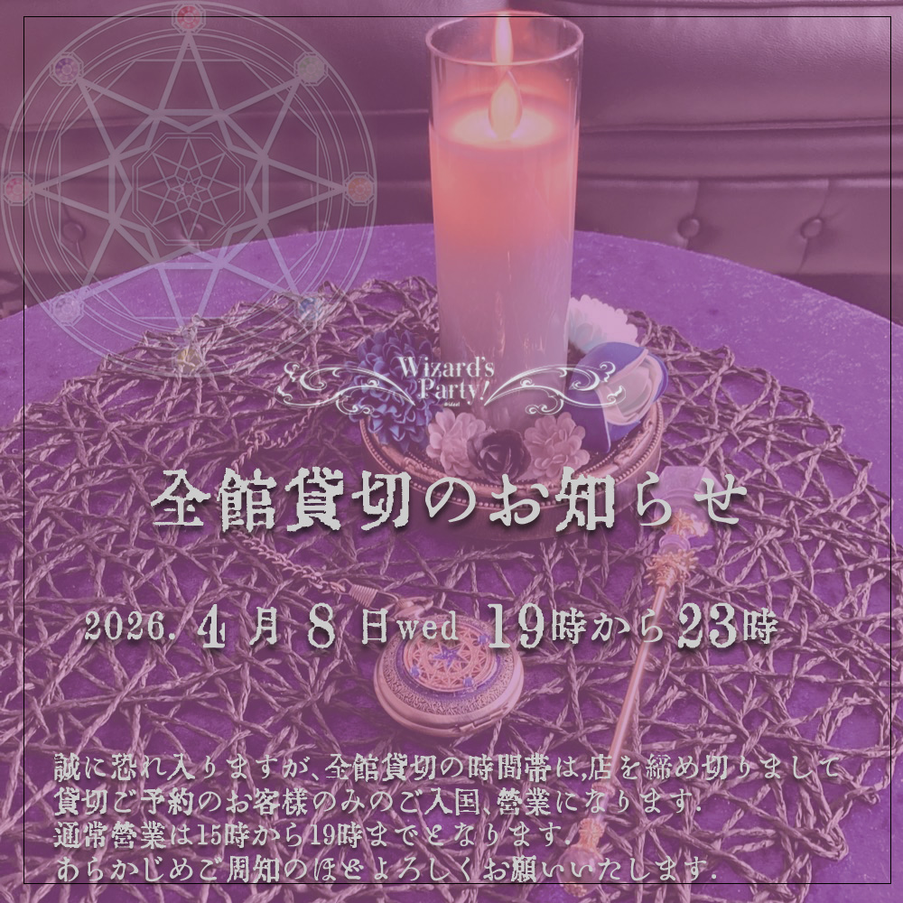 2026.4月8日(水)19時より全館貸切のため、通常営業19時までとなります