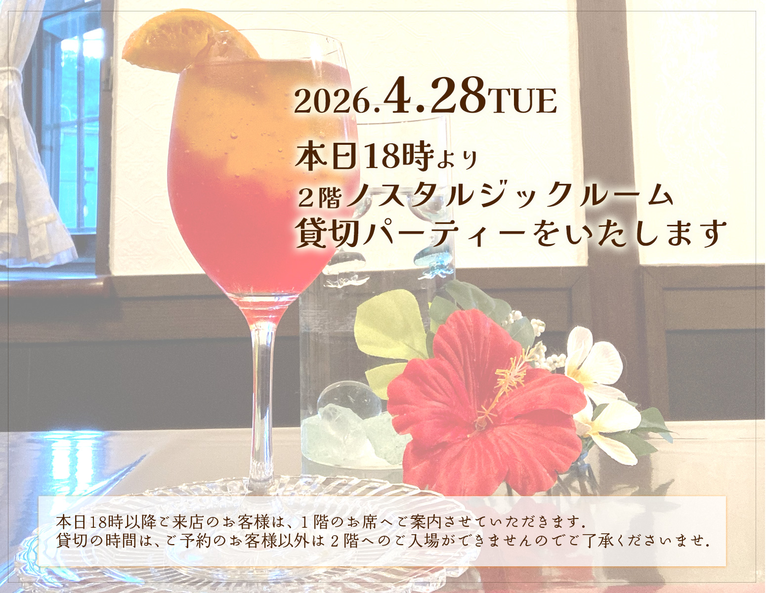 2026.4.28.18時より2階ノスタルジックルームで貸切パーティーをいたします