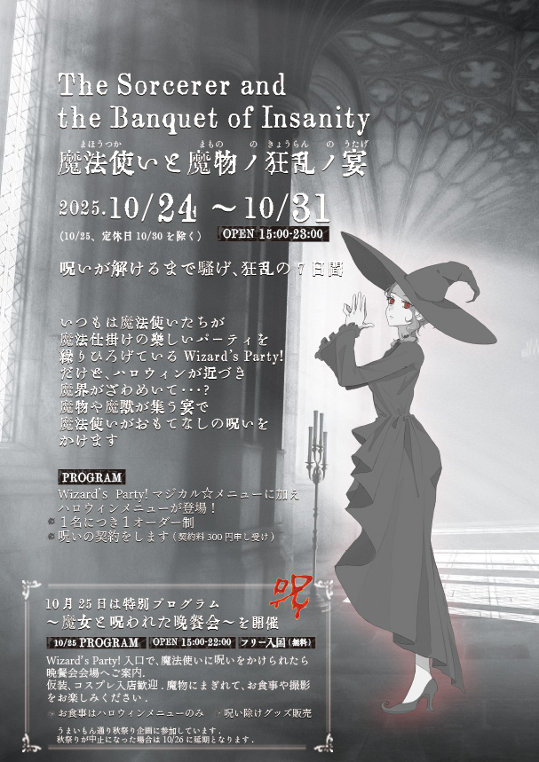 いつもは魔法をかけて、マジカルなパーティーを繰り広げるWizard’s Party!ですが、10月31日のハロウィンの日までは、呪いをかけて、魔物や訪れるお客さまをおもてなし